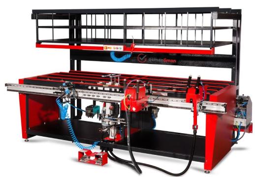 HD - Poloautomatická, nastaviteľná zostava pre vŕtanie pántov a ručný pneumatický skrutkovač na upevnenie pántu 3 - 6 mm. Multifunkčný revolverový systém nastavovania polohy. 2-krokové vŕtanie - západkový posuvný systém, systém pre 3-6 mm.