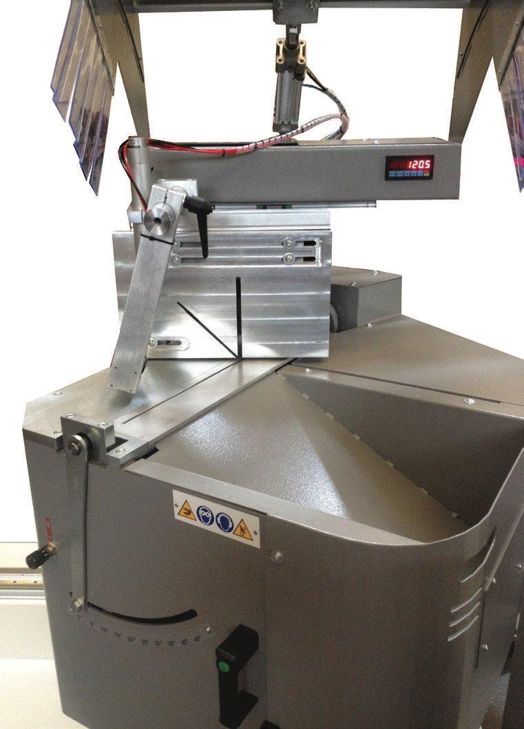 A fejek pneumatikus döntése, mely tartománya 45° és 90°, és a kétlépcsőa függőleges szorítókal, a fűrészlapok teljes védelmével,
