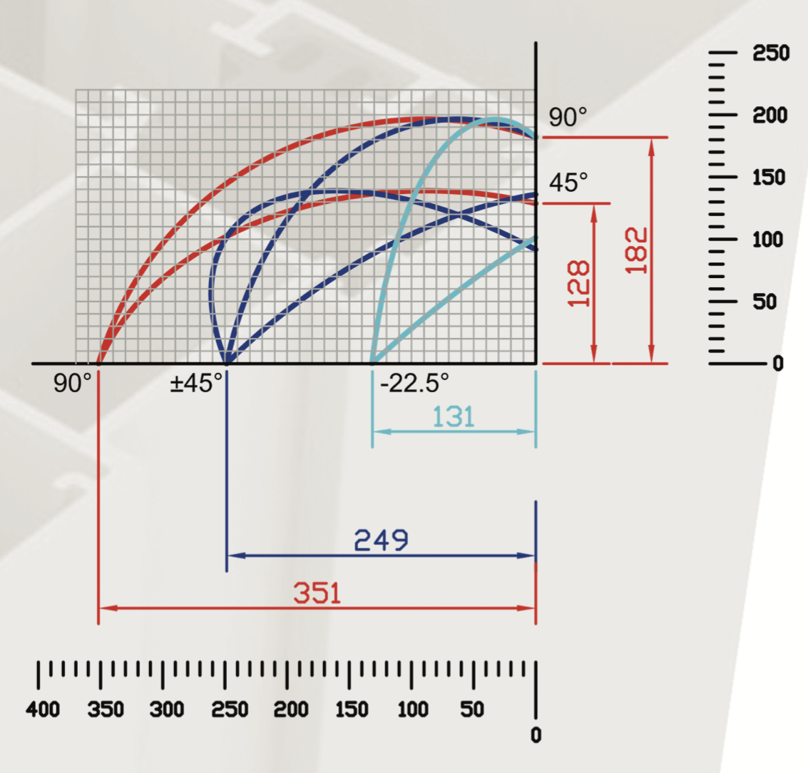 A fűrészlapok elforgatási tartománya 90°-tól 20°-ig befelé és 90°-tól 140°-ig kifelé
