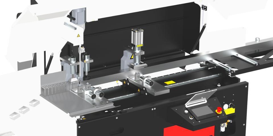 A gép Ø 500 mm-es fűrésztárcsával és szervóvezérelt vágás-futás rendszerrel rendelkezik, amely egyenletes, nagy sebességű vágásokat tesz lehetővé. A profil rögzítése pneumatikus befogással történik az elülső és a felső felületen egyaránt, így a vágási ciklus során minden mozgás kizárt. Miután a profilt behelyezték, a vágás automatikusan, folyamatos ciklusban zajlik a munka befejezéséig.